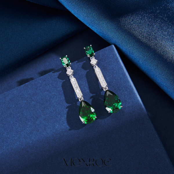 עגילי כסף סטרלינג 925 בעיצוב יוקרתי ומיוחד עם אבני חן בחיתוך אובל על האוזן וטיפה נופלת בצבע ירוק אמרלד וזרקונים מנצנצים